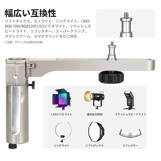 【2つのグリップでより多用途】ローリングライトスタンドはピストルグリップ付き2本のスライディングアームが付属しており、一度に2つの機器を取り付けられ、強化された撮影ソリューションです。取り外し可能で360°回転可能な各アームは1/4"ネジ付き5/8"スピゴットスタッドを備えており、コンパチブル SF30120Q/SF-RPBO26ソフトボックス、モノライト、リングライト、CB60 RGB 70W/RGB1200 LEDビデオライト、フラッシュスピードライト、リフレクター、スーパークランプ、マジックアーム、スマホマウントなど。