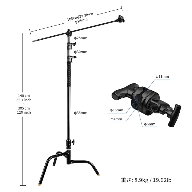 【ヘビーデューティC型スタンド】ステンレススチール製で仕上がり、耐久性があり。クロムメッキ技術で施し、表面は滑らかで、耐摩耗性や耐食性が優れ。ソフトボックス、アンブレラ、フラッシュ、スピードライトなど多くの撮影機材に対応できます。