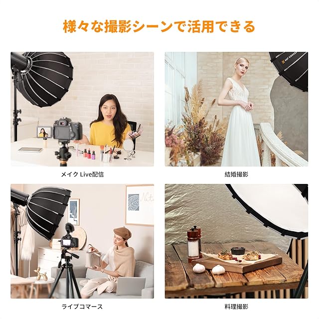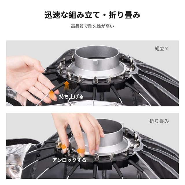 【速いリリースと折りたたみ】合金チャック構造を採用し、ワンピース構造のソフトボックスは、数秒で素早く開閉でき、時間とエネルギーを節約できます。従来のソフトボックスよりも便利で効率的で、屋外に持ち運びが簡単です。