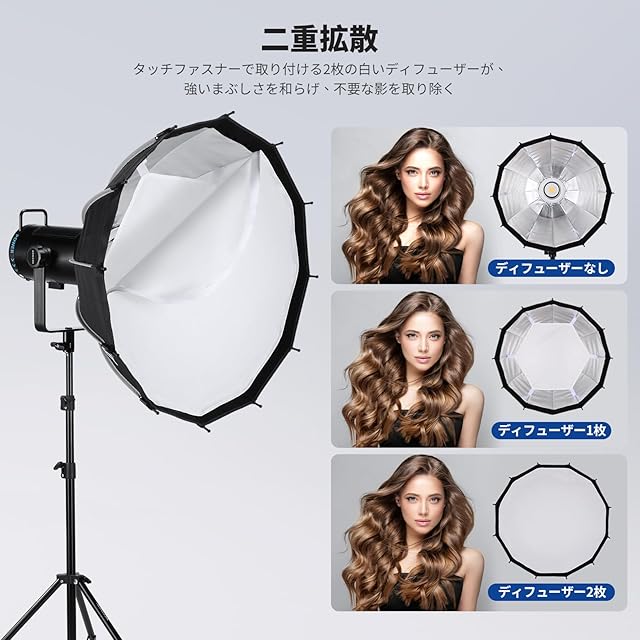 【ハニカムグリッド&ディフューザー】内部と外部ディフューザーを組み合わせて、より柔らかく拡散された光を実現します。タッチファスナーで固定できるため、簡単に組み立てることができます。ハニカムグリッドは光を45°に導き、光のこぼれを抑え、モデルの顔の骨格を際立たせる、ソフトでありながらパンチのある独特の照明効果を提供します。