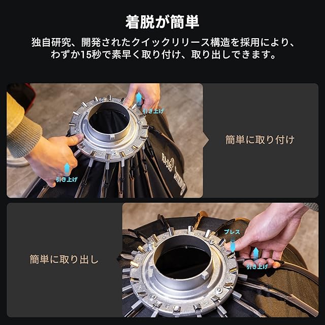 【クイックリリース設計&軽量&折りたたみ式】独自研究、開発されたクイックリリース構造を採用により、わずか15秒で素早く取り付け、取り出しできます。SmallRig ソフトボックスは折り畳み式で、収納しやすい、さらに1.5kgしか持たなく、収納バッグも付属してありますので、持ち歩くのも簡単です。複数の撮影場所を利用する方に非常に便利なライトボックスです。