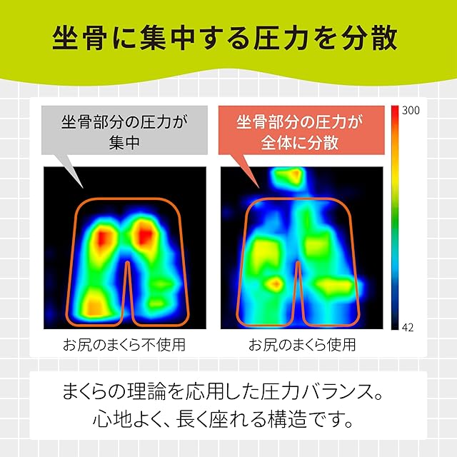 ランバークッションを使用した場合、坐骨にかかる圧力が分散。さらに同シリーズの「お尻のまくら」と合わせて使用することでさらに圧力が分散しより快適に座って過ごすことが出来ます。