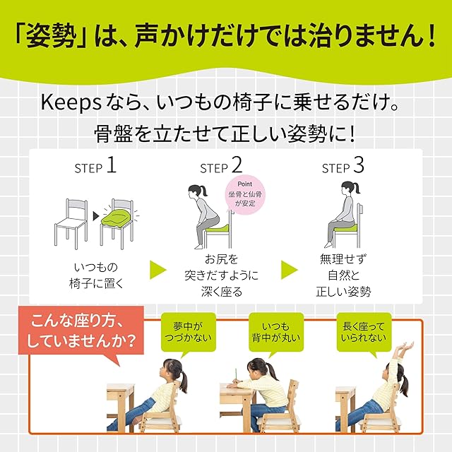 いつもの椅子に置くだけで快適な姿勢が続くサポートクッション「Keeps(キープス)」からキッズモデルが登場!姿勢が悪い、じっと座っていられない、集中力がない…そんなお子様にも是非使っていただきたい、子供のための夢中がつづくクッション です。