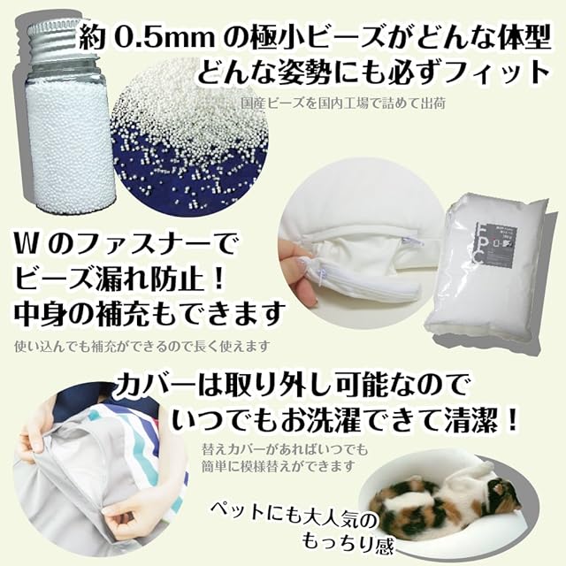組成 外カバー・伸びる生地:ポリエステル85% ポリウレタン15% 伸びない生地:綿100% 中材:側生地 ポリエステル95% ポリウレタン5% / 詰め物 発泡ポリスチレンビーズ(直径約0.5mm)