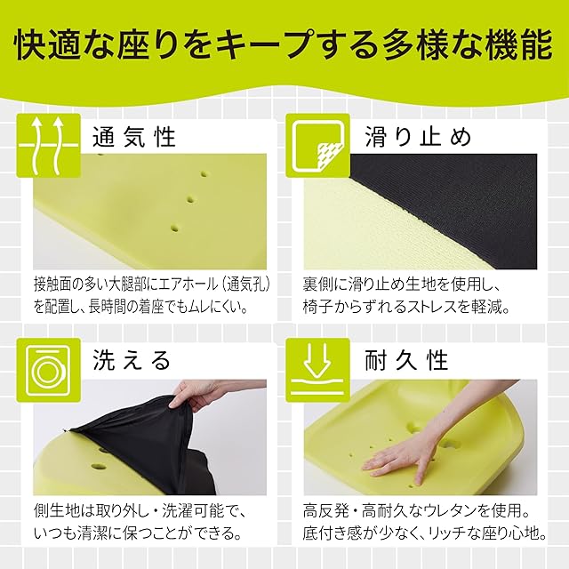 表生地は抗菌加工で衛生的。裏生地には滑り止め加工付き。椅子からクッションがズレるストレスを軽減して快適にご使用いただけます。