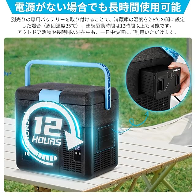 【大容量で長時間使える】このバッテリーの容量が15600mAhで電力量が173Whです。 冷蔵庫の温度を2〜8℃の間に設定した場合(周囲温度25℃)、内部温度が安定した後、12時間使用できます。ドアの開け閉めの回数による時間が変わることがあります。別売りの専用バッテリーを取り付けることで、庭や海辺、キャンプ場などの電源のない場所でも使用できます。アウトドア活動や長時間の滞在中も、一日中快適にご利用いただけます。