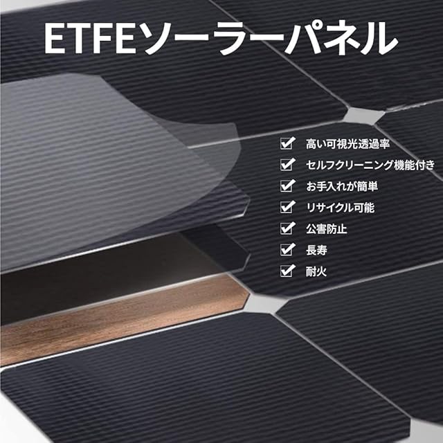 【ETFE素材採用】Jackeryソーラーパネルは特殊フッ素樹脂コーティングETFEを採用しております。ETFE素材は他のフッ素樹脂に比べて塗膜厚が厚く、耐熱・耐食などにも長けており、耐久性などが求められる工業用部品などにも用いられます。ETFE素材採用したJackeryソーラーパネルは光透過率が高く、信頼性が高いため、燃焼や爆発の危険がありません。防水機能はIP65防水等級となっており、通常の雨や風にはIP65規格(電気機械器具の保護等級)に適合しています。ただし、完全防水ではありませんので、近年のゲリラ豪雨や台風などには耐用できないため予めご注意ください。 ※風雨の浸入は故障の原因になります。