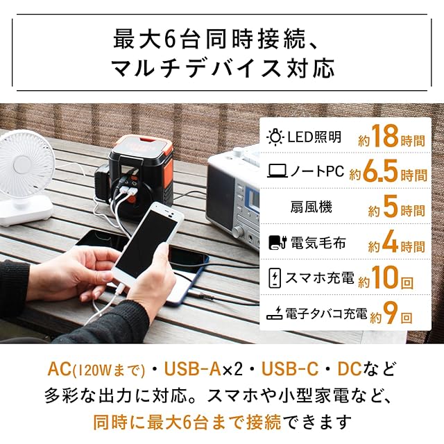 【6つの機器に電源供給】ジャック部分はACアース付き3芯、USB-A×2、USB-C×1、SCの6箇所あり、LED照明やスマートフォンの充電、扇風機、電気毛布などを接続して使用することができます。