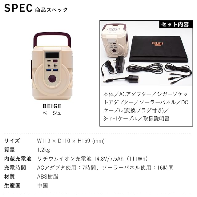 【本体】内蔵充電池:リチウムイオン充電池 14.8V/7.5Ah(111Wh)、定格入力|DC19V/1.5A(最大)、定格出力|AC:AC100V 50Hz 1.2A、USB-C:5V/3A, 9V/3A, 12V2.5A, 15V/2A, 20V/1.5A (Power Delivery 対応)、USB-A:5V/2.1A, 9V/2A (Quick Charge 3.0 対応)、DC:DC12-16.6V/10A、出力端子|AC:アース付3芯/2芯、DC:DC12V、USB-A x 2、USB-C、充電時間(約)|(ACアダプタ使用)7時間、(ソーラーパネル使用)16時間、外形寸法(約)|幅119 x 奥110 x 高159 mm 【ソーラーパネル】最大出力|21W、変換効率|20%、最大外形寸法(約)|(最大)幅290 x 奥820 x 高25 mm、(折り畳み時):幅290 x 奥195 x 高35 mm