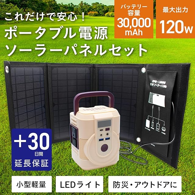 大容量リチウムイオン充電池内蔵(30,000mAh)のポータブル電源とソーラーパネルのセット。非常時やアウトドアでの電源確保やスマホの充電がいつでもどこでも可能です。