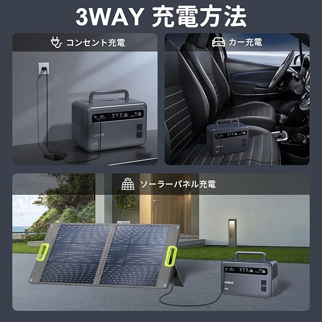 【3種類の充電方法】ACコンセント(90W)、シガーソケット(72W)、ソーラーパネル(72W)、3つの充電方法が備えます。エコな電力や環境保護の観点という、蓄電池の充電にはできるだけソーラーパネル(CTECHi 100Wソーラーパネルお勧め )を使用することをおすすめします。(ご注意:充放電機能を使用する場合、充電電力が放電電力より小さいと、電源は充電されません。)