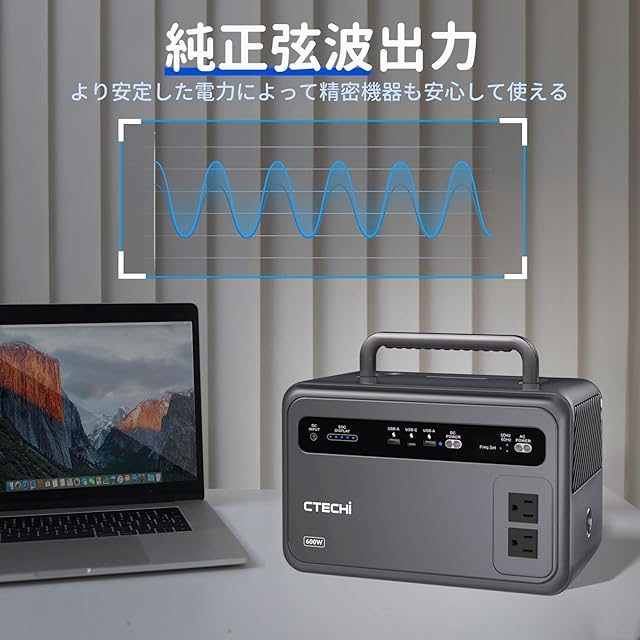✅【384Wh大容量・600W高出力】CTECHi ポータブル電源GT600は、384Whの超大容量、AC定格600W(瞬間最大1200W)の機器に給電できます!キャンプ、車中泊、アウトドアで家庭用蓄電池が使えて便利です。屋外作業、停電や災害時、交流電源が使用できない時の備えにも最適です。AC出力は家庭用コンセントと同様の純正波形を採用しているため、電気製品にダメージを与える可能性が極めて低いです。安心安全でご使用頂けます。