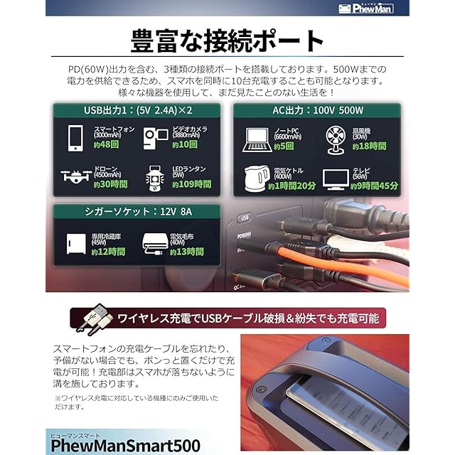 商品名:PhewMan Smart ポータブル電源 大容量 500W / 643Wh ( ワイヤレス充電 搭載 / 純正弦波 / MPPT制御方式 ) 174,000mAh ポータブルバッテリー 修理サポート対応 [国内企業販売]