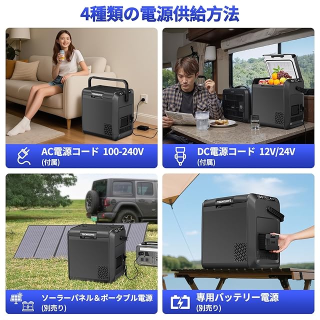4WAY電源対応|AC/DC/バッテリー/ソーラー。AC100–240VとDC12/24Vの両電源対応。専用バッテリー(別売)使用で9時間以上連続稼働可能。駐車中は自動でバッテリー電源に切替。ソーラーパワーステーションとも互換性があり、完全オフグリッド使用が可能。ドライブ旅行、車中泊、災害時の非常用冷蔵庫としても活躍。