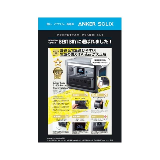 パーケージ内容: Anker Solix C1000 Portable Power Station (ブラック)、AC充電ケーブル、シガーソケット充電ケーブル、安全マニュアル、、カスタマーサポート Anker Solix PS100 Compact Portable Solar Panel 製品本体、MC4 & XT-60ケーブル (0.5m) 、MC4 & MC4延長ケーブル (3m) x2、XT-60 & DC7909コネクタ、安全マニュアル、 、カスタマーサポート