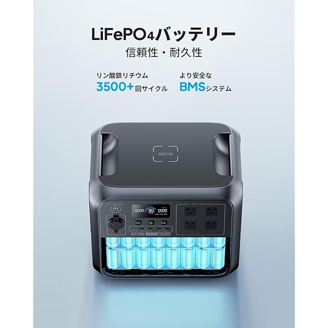 【自己消費電力の削減】AC180は他社のポータブル電源に比べて、内部の無負荷損失を最適化し、ECOモードでより省電力を実現します。また、スマホより「BLUETTI」アプリで電源のオフ時間を自由に設定できるため、夜間電力や太陽光発電をフル活用することができ、電気代の節約や環境にも配慮しています。高い安全性と長寿命のリン酸鉄リチウムバッテリー(LiFePO4)を採用し、充放電サイクル3500回後も残存量は80%以上を維持します。1日1回の充放電と仮定すると、10年以上使用できることになります。