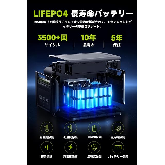 【リン酸鉄リチウム蓄電池・充放電3500+回サイクル長寿命】ALLPOWERS R1500 家庭用大容量蓄電池はリン酸鉄リチウムイオン電池が搭載されて、安全で安定したバッテリーの稼働をサポート。充放電サイクル回数が、約3500+回後も残存量は80%以上を維持します。また、過温度保護、低温度保護、過放電保護、過負荷保護、短絡保護、過電圧保護、過電流保護、バッテリー保護などの保護機能を備えた最新の「バッテリー管理システム(BMS)」を採用して、製品をより安全かつ安心してご利用いただけます。