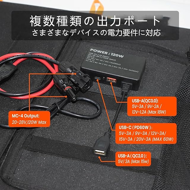 【パッケージ内容と IP67 防水】1 台の 120W 折りたたみ式ソーラーパネル、1 本のソーラー充電アダプターケーブル(XT60、Anderson、DC7909、DC5521 インターフェース付き)が付属しており、市場に流通する 90%のパワーステーションの充電に対応可能です。IP67 防水認定を受けているため、激しい雨やほこりなど、さまざまな気象条件に耐えることができます。