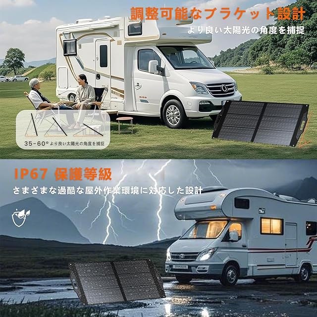 【24% の高変換効率】:パネルは高透過率の ETFE 素材でコーティングされており、わずかに凸状の表面を持つことで太陽光との接触面積が増加し、エネルギー変換率が向上します。このソーラーパネルは傷がつきにくく、長期的な耐久性をします。雨、砂、ほこりを恐れる必要がなく、耐食性、耐傷性、高い防水性を備えているため、過酷な環境にも容易に対応でき、使用寿命が延長されます。