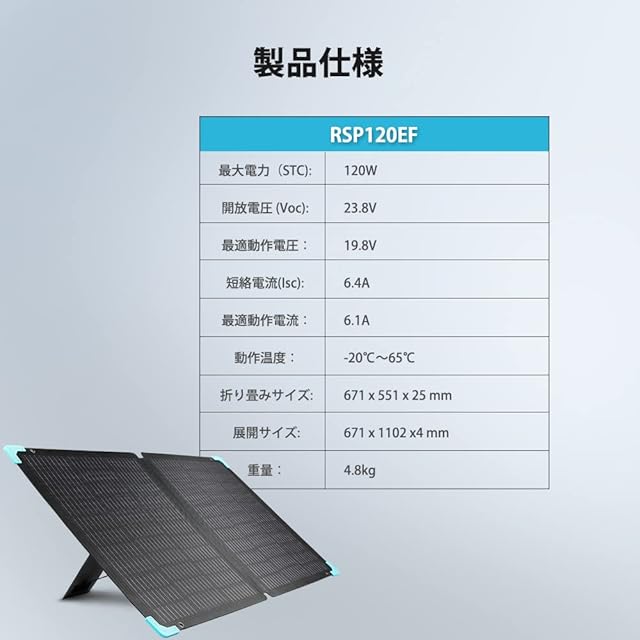 【急速充電】最大出力動作電圧 (Vmp) 19.8V、最大出力動作電流 (Imp)6.1A、一日の発電量目安は600whになります。 500whのポータブル電源はおよそ3時間で充電完了。