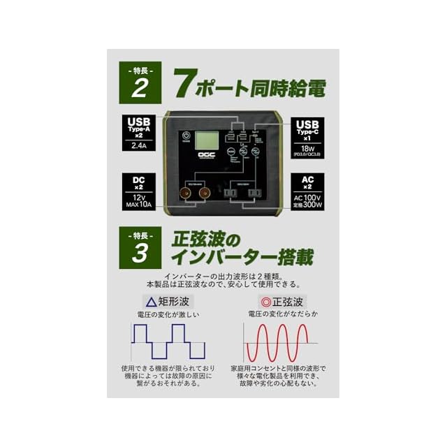 AC100V正弦波で使用機器を選ばない。バッテリーが劣化しても交換することで長く使える。
