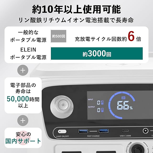 【リン酸鉄リチウムイオン電池使用で長寿命】電子部品の寿命は50,000時間以上で、適正な環境及び利用方法であれば1日1回使用しても約10年以上、充放電サイクルも3,000回(電池容量が初期容量の80%程度に劣化するまでのサイクル)を実現しました。