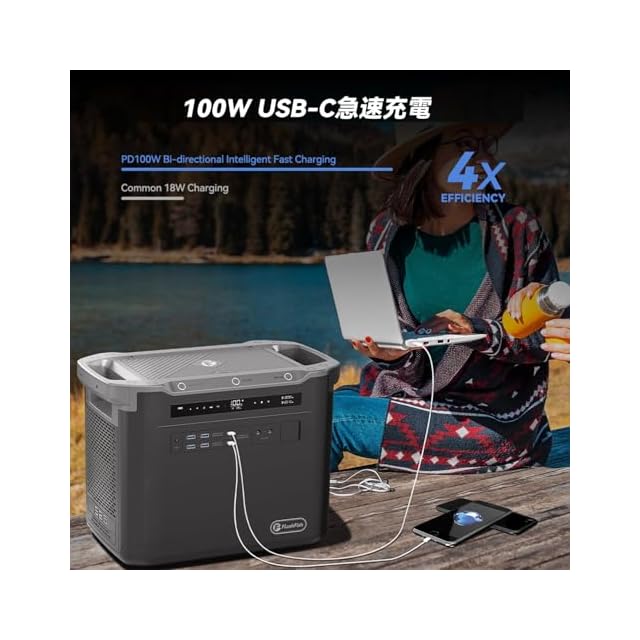 【最大12デバイスを同時給電可能】FlashFish大容量ポータブル電源は12つの出力ポートを搭載して、省電力の車載用品、アウトドア用品をはじめ、幅広い機器に充電が可能です。3つの定格出力2000WのACコンセント、2つの100W急速充電に対応したUSB-Cポート、4つのUSB-Aポートおよび2つのDCポート、1つのシガーソケットを搭載し、12台同時に充電できます。大容量だけでなく、出力ポートの数や種類も豊富で使い勝手が良いです。大人数でも安心してご利用いただけます。USB-Cポートは最大100W急速充電で、従来の何倍以上の速度で充電が可能となり、緊急時に大活躍してくれる機能です。