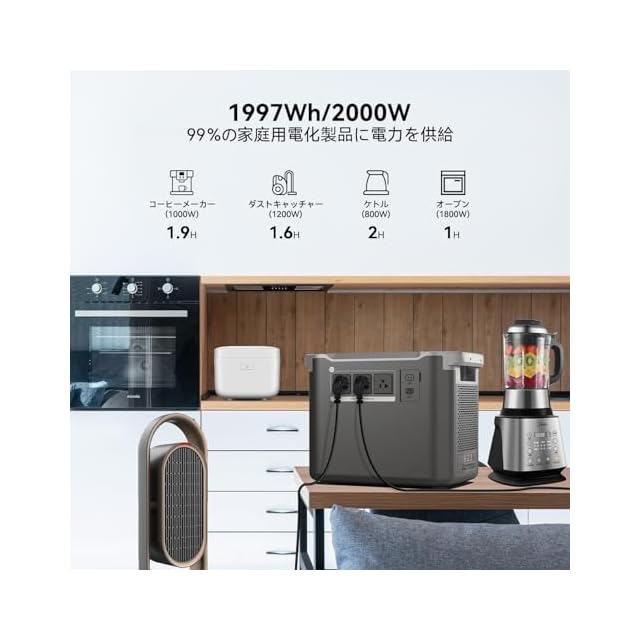 【余裕な大容量1997Wh、定格2000Wの高出力】バッテリー容量1997Wh、定格出力2000Wのパワフルなポータブル電源として、95%以上の家電製品を動かすことができ、停電時にも家族に数日間の電力を供給することができます。ポータブル電源は一度フル充電して、スマホを約130回、カメラを約100回、冷蔵庫(520W)を約3.2時間、電気ケットル(1200W)を約1.4時間の充電ができます。スマホやノートパソコンなどのモバイル端末から、高出力の電動工具や調理家電まで幅広い機器に給電可能です。アウトドアから災害時まであらゆるシーンで活躍します。家庭での備えや、オフィス、工場、自治体での防災用品としても非常に役立ちます。