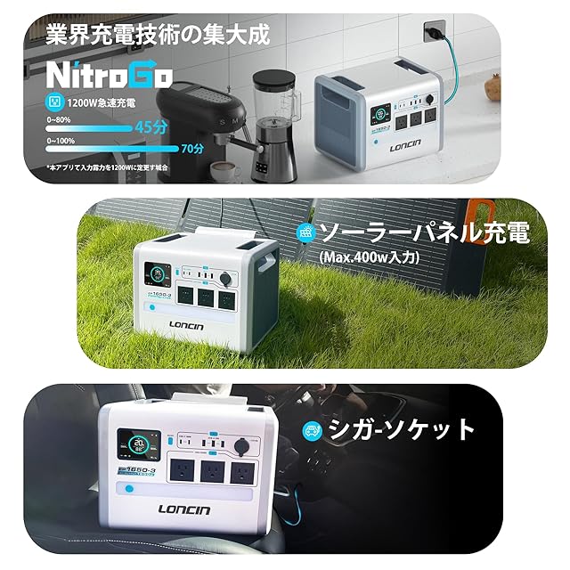 Loncin ポータブル電源 ポータブルバッテリ 1024Wh大容量 AC(定格1500W+SpurFluxで2000W)9台デバイス同時利用 45分で80%まで急速充電 ソーラー/車載充電 リン酸鉄リチウムイオン電池-10年寿命 アプリ遠隔操作可能 EPS/パススルー機能付き 家庭 日常生活 アウトドア キャンプ 車中泊 防災グッズ 非常用電源 停電対策