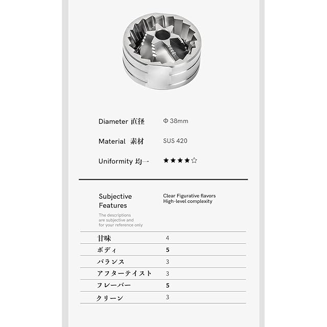 切れ味の良い刃| CNC加工でステレス臼刃は均一な挽目を実現し、微粉の発生量も最小限に抑えて、豆の味を損ないません。