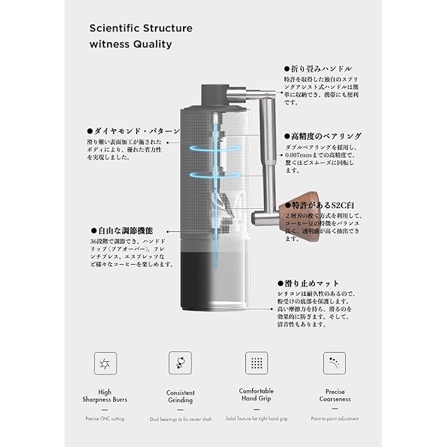 簡単な調節機能 |ダイヤルのクリックにより粒度を36段階で調節でき、ハンドドリップ 、フレンチプレス、エスプレッソなど様々なコーヒーを楽しめます。