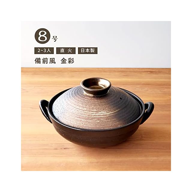 ■販売内容<br/> 備前風 金彩土鍋 8号 1個<br/> ※商品画像「販売内容」以外のアイテムは付属しません。<br/> <br/> ■サイズ(cm)<br/> ※焼き物の特性上、サイズ・重さ・容量の記載がある商品は個体差がございます。<br/> ・外寸<br/> 幅 31<br/> 奥行 24.5<br/> 高さ 15.5<br/> <br/> ・内寸<br/> 幅 21.5<br/> 高さ 7<br/> <br/> 重量約 2,200g<br/> 容量約 1,900ml<br/> <br/> ■素材<br/> 耐熱陶器<br/> 日本製(萬古焼)<br/> <br/> ○使用可⇒直火、オーブン、電子レンジ<br/> ×使用不可⇒ IH<br/> <br/> 商品の色やイメージは実際と異なる場合がございます。予めご了承ください"<br/> <br/>