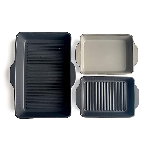SサイズはLサイズの半分の大きさで一般的なグリルに2つ並べて使用可能。1つは焼き料理に、もう一つはデザートに、という具合に同時調理ができ、2品が1回の調理工程で済むので時短にもなります。作りたてをそのまま食卓に並べれば食器としても使え洗い物が少なくすみます。シンプルでスタイリッシュなデザインは食卓をおしゃれに演出。