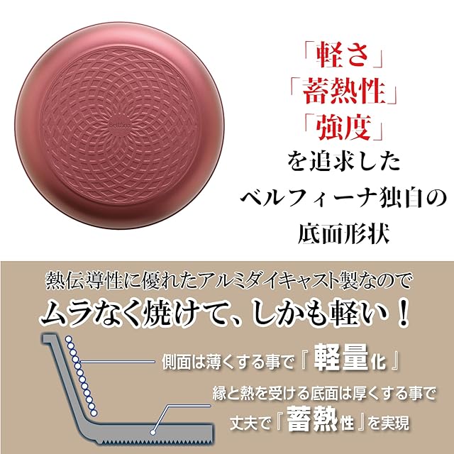 【耐磨耗100万回のコーティング】内側はベルフィーナ独自の耐磨耗100万回のコーティングなので、少ない油で調理できて快適&ヘルシー!