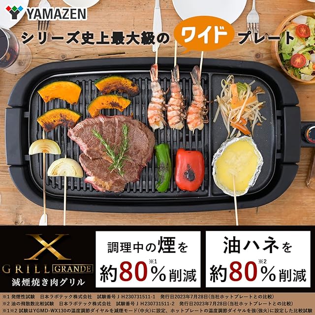 [山善] 焼き肉グリル 減煙 ワイドプレート XGRILL GRANDE「素早く、美味しく焼ける」 煙約80%/油ハネ約80%カット 高火力 (温度調節 約80~250℃) 保温 焼き肉プレート 油受け皿付き 簡単お手入れ YGMD-WX130(B)