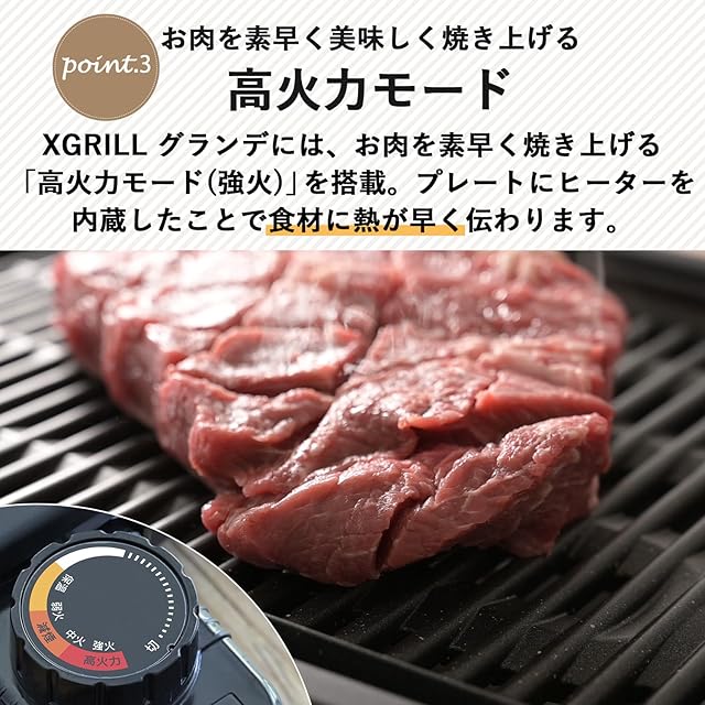 【「減煙モード」で、煙と油ハネを約80%カット】プレートの焼き面は「ダイヤモンド」形状(曲線)、裏面は「X」形状にしたことで、効率的に油を落とし、煙の発生と油ハネを抑えます。XGRILLグランデには、煙や油ハネを軽減する「減煙モード(中火)」と、お肉を早く焼き上げる「高火力モード(強火)」を搭載しており、「減煙モード」では煙と油ハネを約80%(※)カット、「高火力モード」はお肉を早く焼きたいときに便利です。※発煙性試験 日本ラボテック株式会社 試験番号JH230731511-1 発行日2023年7月28日(当社ホットプレートとの比較)、油の飛散数比較試験 日本ラボテック株式会社 試験番号JH230731511-2 発行日2023年7月28日(当社ホットプレートとの比較)、試験はYGMD-WX130の温度調節ダイヤルを減煙モード(中火)に設定、ホットプレートの温度調節ダイヤルを強(強火)に設定した比較試験