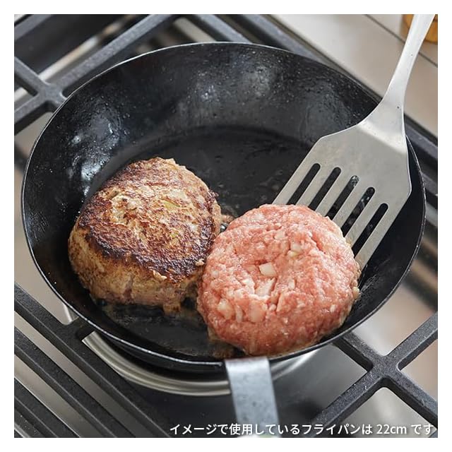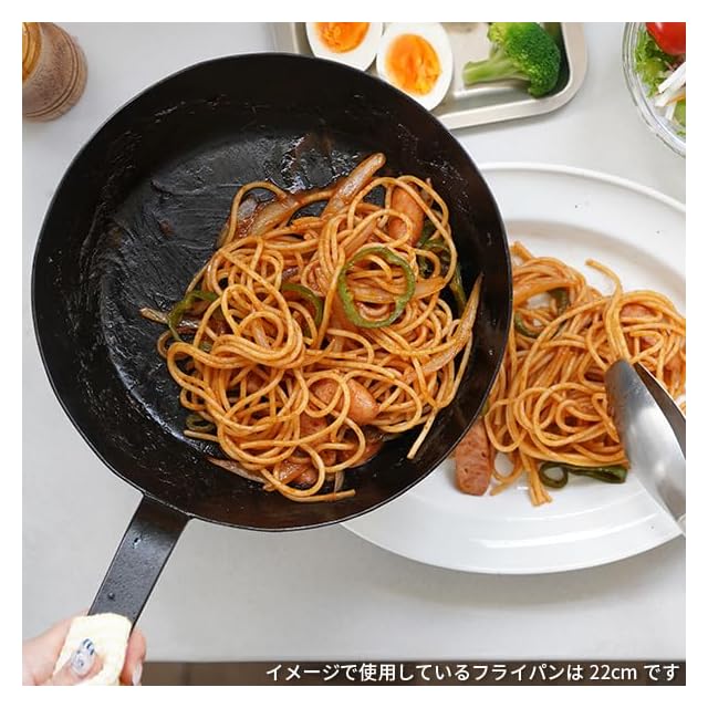 優れた蓄熱性で、いつもの料理を美味しく仕上げてくれる鉄フライパン。<br> 高温&短時間の調理で、野菜はシャキシャキ食感、パラパラの炒飯やオムレツもふんわり、じっくり火を通すステーキ肉も強火で旨みを閉じ込めた調理に近くなりジューシーに美味しくいただけます。<br> フライパンを横から見た角度はまさにプロ仕様の道具さながら。<br> ガランドウが考える“定番の鉄フライパン”を、新潟県三条市で創業150年の鍛冶屋「近藤製作所」に、一つ一つ手打ちで鍛造してもらいました。<br> 本体と柄は溶接で仕上げ、スタイリッシュで洗練されたデザインに。引っ掛かりが無く、お手入れがしやすいのはもちろん、キッチンに吊るしておいても様になります。<br> 丁寧なお手入れで、一生ものになる鉄のフライパン。手作業ならではのひとつひとつ違った風合いを味わいながら育て可愛がってください。