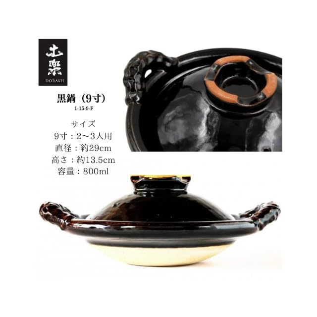 土楽 黒鍋 サイズ:9寸(2~3人用、直径:約29cm、高さ:約13.5cm、容量:800ml)