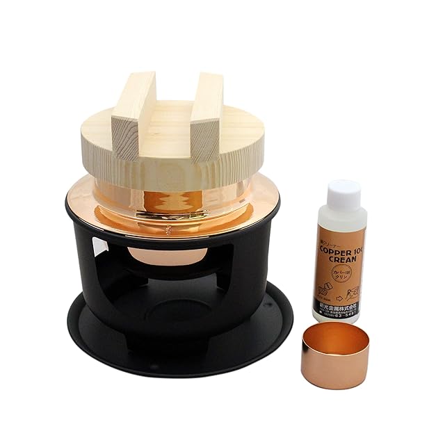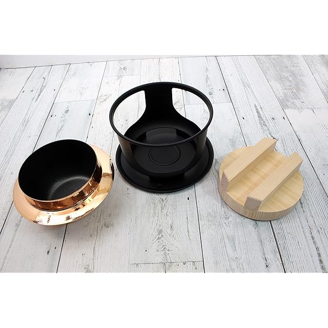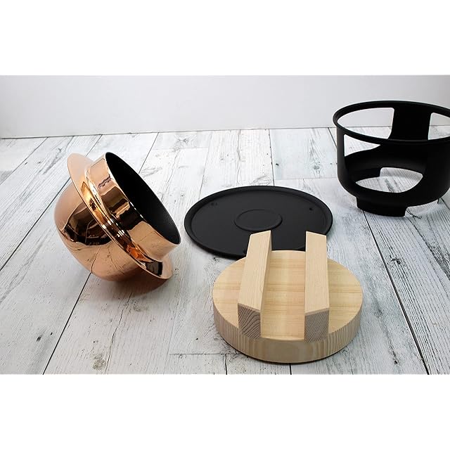 素材:本体:純銅(外側:素銅、内側:高強度セラミック溶射フッ素樹脂加工)、蓋:二重構造18-8ステンレス、受台:天然木(桐)