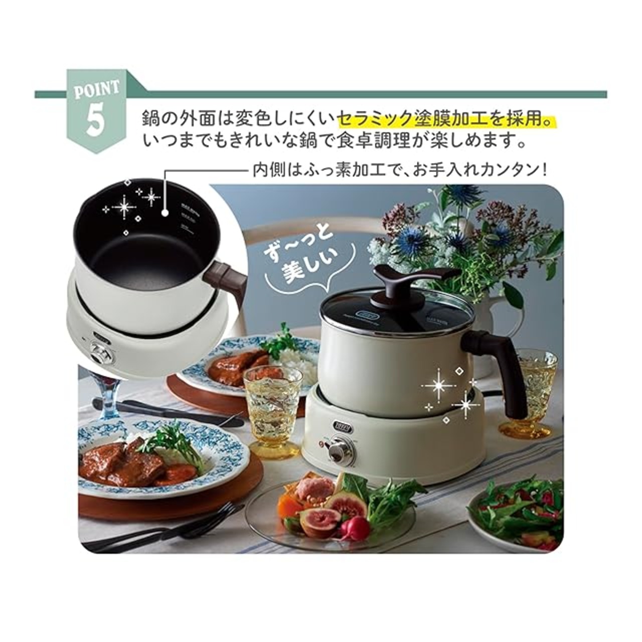 1台7役の電気鍋! 火を使わない手軽さで、卓上にそのまま置いて調理ができます。 コンパクトながら1.6Lとたっぷり容量!火力は保温~約240℃まで細かく無段階調節ができ、 鍋料理はもちろん、2合のお米が炊けたり、卓上で揚げ物調理ができたりと毎日大活躍! 注ぎ口が付いているためミルクパンとしての使用にも便利です。