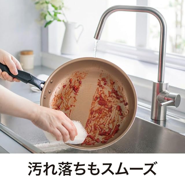 こびりつきづらく汚れ落ちもスムーズでお手入れ簡単なストレスフリー。少量の油でお料理ができて、少量の洗剤でお手入れもできる、経済的で環境にも優しいエコフレンドリーなフライパンです。