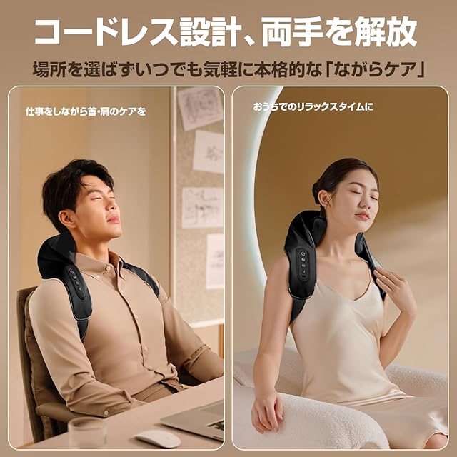 【コードレス設計、両手を解放】USB-C充電式設計で、使用時に電源に接続する必要はありません仕事中に椅子に座りながら、リビングでテレビを見ながら、ソファに横になりながらなど、ながら使いしたい人は、やはりコードレスで使えるネックリラクゼーション器が便利バックルストラップのデザイン、手で引っ張る必要がなく、手を解放します仕事をしながら肩や首のケアができます