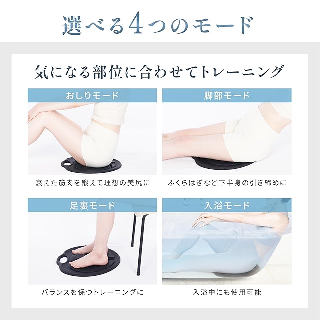 【4つのモードで効率的にトレーニング】「入浴モード」「おしりモード」「足裏モード」「脚部モード」の4種からお好みのモードを選択。ヒップケア以外にもふくらはぎの引き締めや骨盤底筋のケアなど気になる部分を鍛えられます。