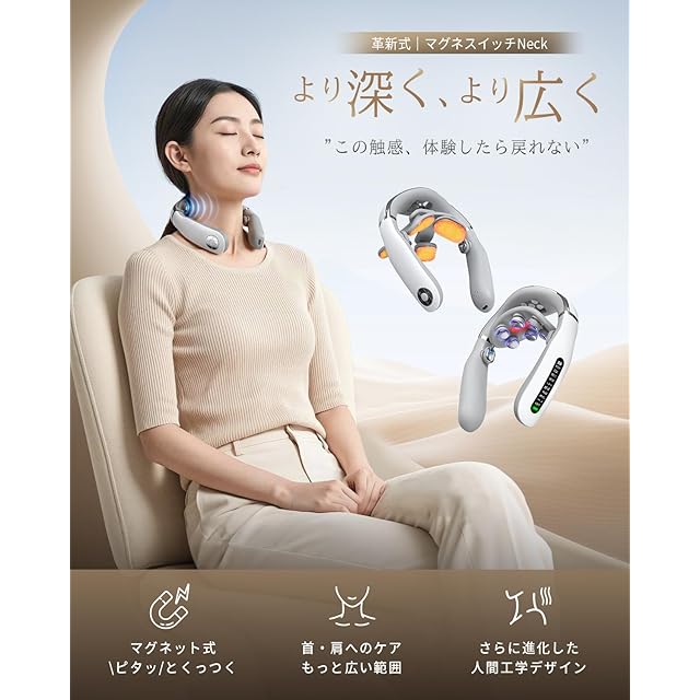 【業界初!次世代首リラクゼーション器 より深く より広く】深層ほぐすピンポイントケアと首・肩へのフールケアを両立!プロが手もみで行うような本格的な10種のネックケアを再現。独自のトリプル機能を搭載して、EMS+TENS+振動の相乗効果により、本格的な首・肩ケアを実現。やわらかタッチからしっかりケアまで、19段階で微調整可能。本格的な温熱機能を搭載し、首まわりの冷え対策にもピッタリ。温めるだけで、ずいぶん楽になる快適サポートされます。※温熱のみ単体使用もOK!