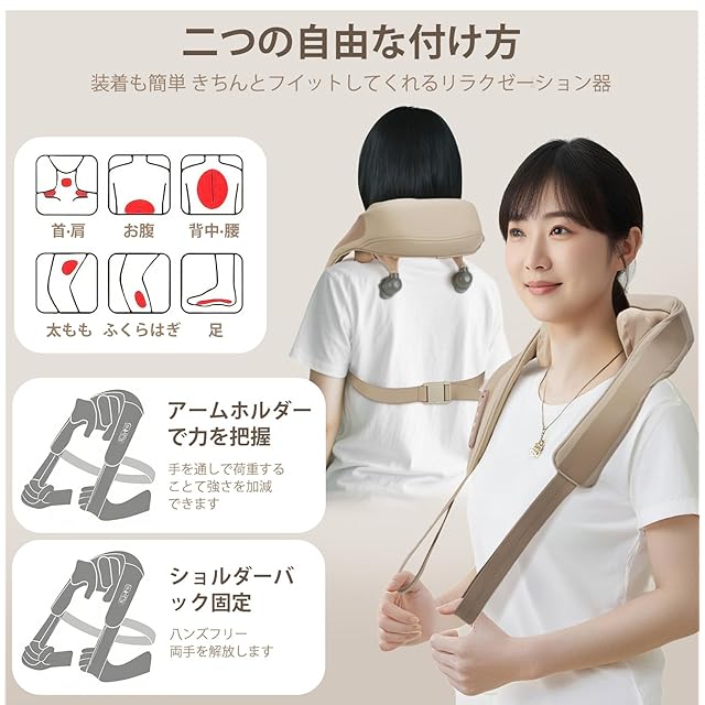 【首や肩甲骨を幅広くケアします】4つのもみ玉と、首にしっかりフィットする手もみアームが、首と肩の筋肉に深く刺激を与えます。