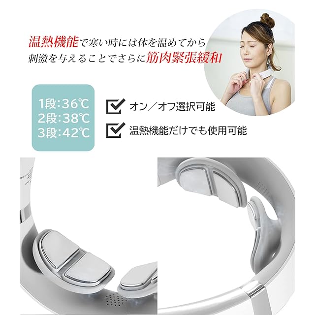 【加熱機能】電極パネルが42℃まで加熱されるので、首周りを温めながらパルス刺激を加えることで効果がさらに増大します。ON/OFFもでき、温熱機能単独でも使用できるので、寒い冬はマフラーの代わりにもなります。