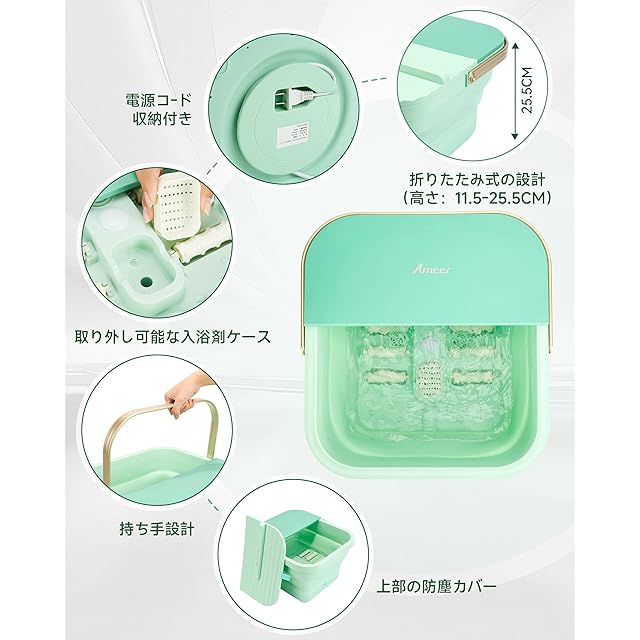 Ameer 足湯器 足湯 フットバス 折り畳め 浴剤可 高温自動オフ バブル機能 加熱・保温機能付き 隠し電源収納 取っ手付き 蓋付き 日本語取扱説明書(PRO 版 リモコン付き、4 段階の温度調整)