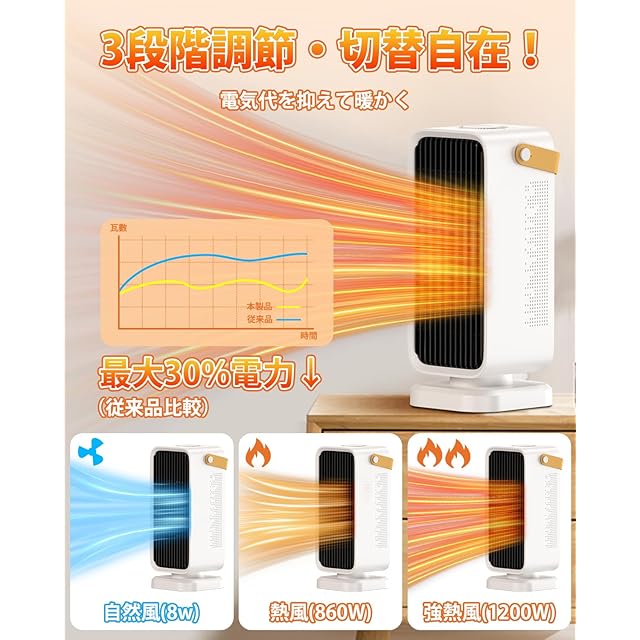 【急速暖房 & 3 段階調節で使い勝手抜群】 高性能 PTC セラミックヒーターが瞬時に熱を発生!朝起きて冷たい手を伸ばす瞬間、スイッチを入れればすぐに暖かさを感じられます。自然風で風通しを良くしたり、弱暖房でゆったりとした居心地を作ったり、強暖房で急いで部屋を暖めたり…… 季節やムードに合わせて自由に調節できるのが魅力です。