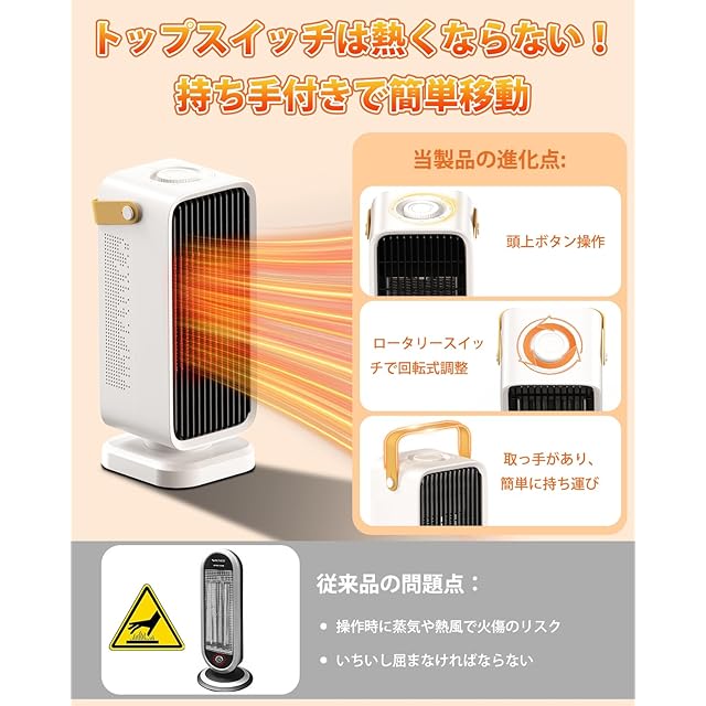 【使いやすさにこだわった操作性】 トップ部分に調節ロータリースイッチを配置し、熱くならない設計になっているので、暖房をつけている最中でも安心してつまみ換えができます(他の製品はロータリースイッチが下にあり、熱くて触れないことが多いのに比べ、圧倒的に使いやすいです。)さらに取っ手が付いているので、リビングから寝室へ、オフィスから車内へと、暖かさを簡単に持ち運べます。