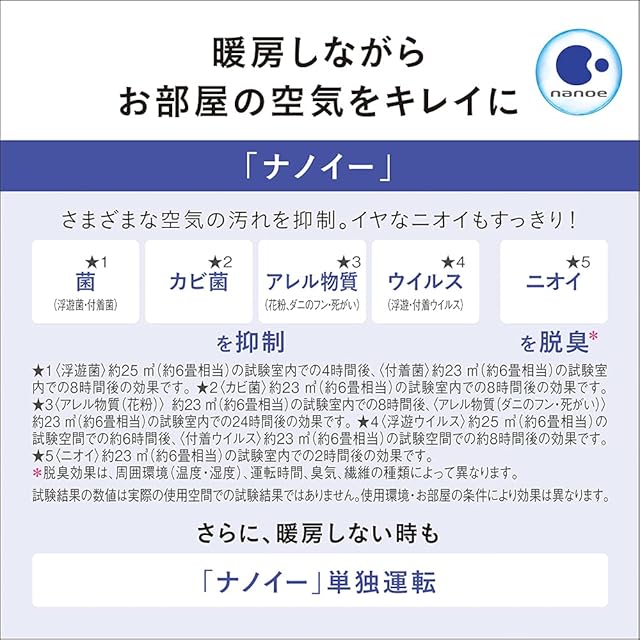 ナノイーで菌・カビ菌・アレル物質・ウイルスを抑制、ニオイを脱臭。ナノイー単独運転機能搭載でオールシーズンナノイー使用可能。